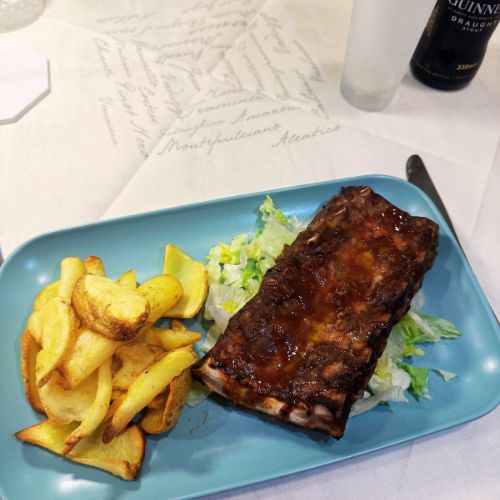 BBQ RIBS - 1 BAFFA Costine di maiale cotte in sottovuoto con salsa Barbecue servite con patate* Dippers e salsa Barbecue - 1 baffa